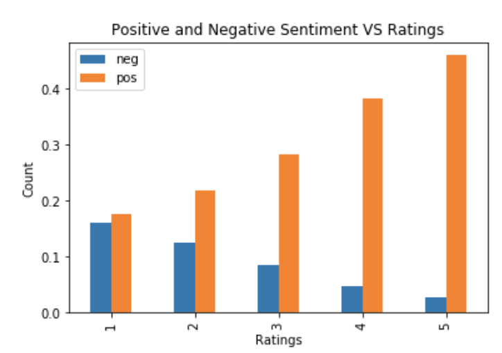 However these results are not conclusive, if they are not associated with the actual ratings of the reviews. The graph below shows the comparison of negative and positive sentiment scores and the ratings of the reviews. The negative sentiment score decreased from one to five ratings. On the other hand, the positive sentiment score increased from one to five ratings. In an ideal case, reviews with ratings of one and two would have a much higher percentage of negative sentiment than positive sentiment. However, this graph shows that rating one has a higher percentage of a positive sentiment score than a negative score. We can also see this with rating number two.